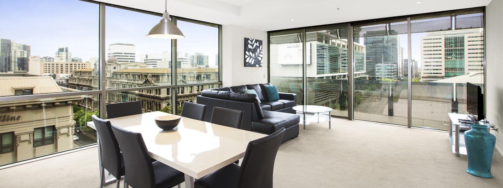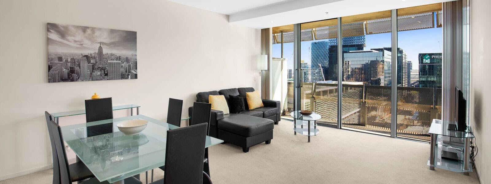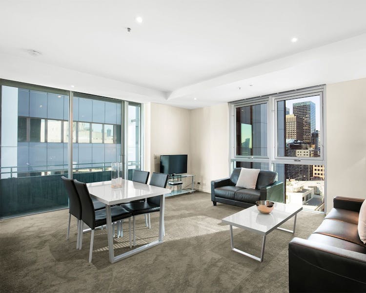 Our Two Bedroom apartments offer 70 square metres of fully-equipped living and dining area, spacious bedroom and bathroom with access to the building facilities, a including pool, spa, sauna and gym at the 8 Downie Street, Melbourne location, and a pool, gym and tennis courts at the 668 Bourke Street,Melbourne location.