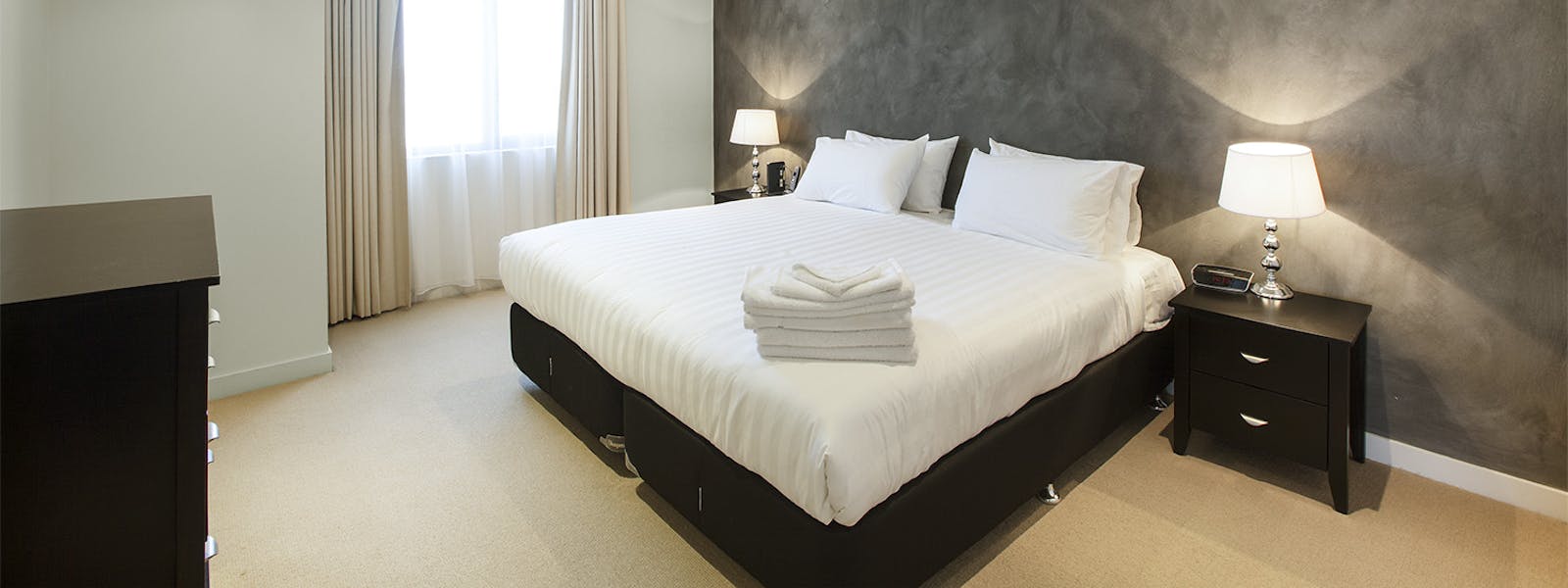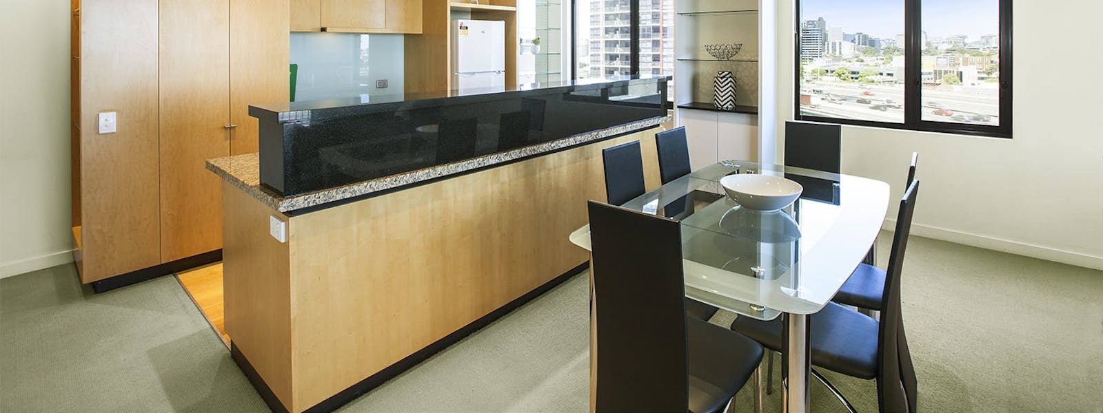 Our One Bedroom + Study apartments offer 60 square metres of a fully-equipped living and dining area, spacious queen bedroom, separate study/single bedroom including a full sized single bed, bathroom and access to the building facilities, a including pool, spa, and gym.